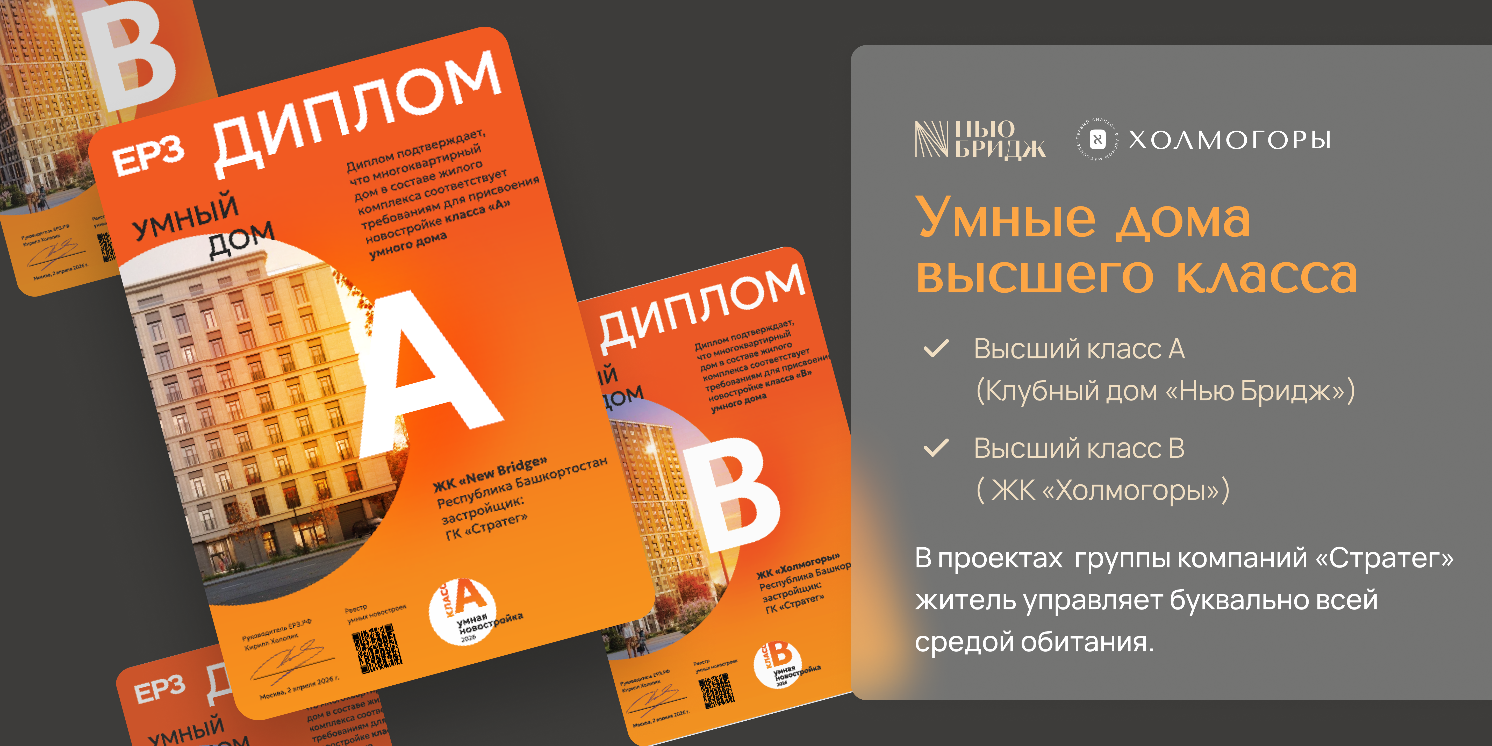 ЖК «Холмогоры» и Клубный дом Нью Бридж (New Bridge) получили высшие классы «умных» многоквартирных домов по версии реестра ЕРЗ. РФ.